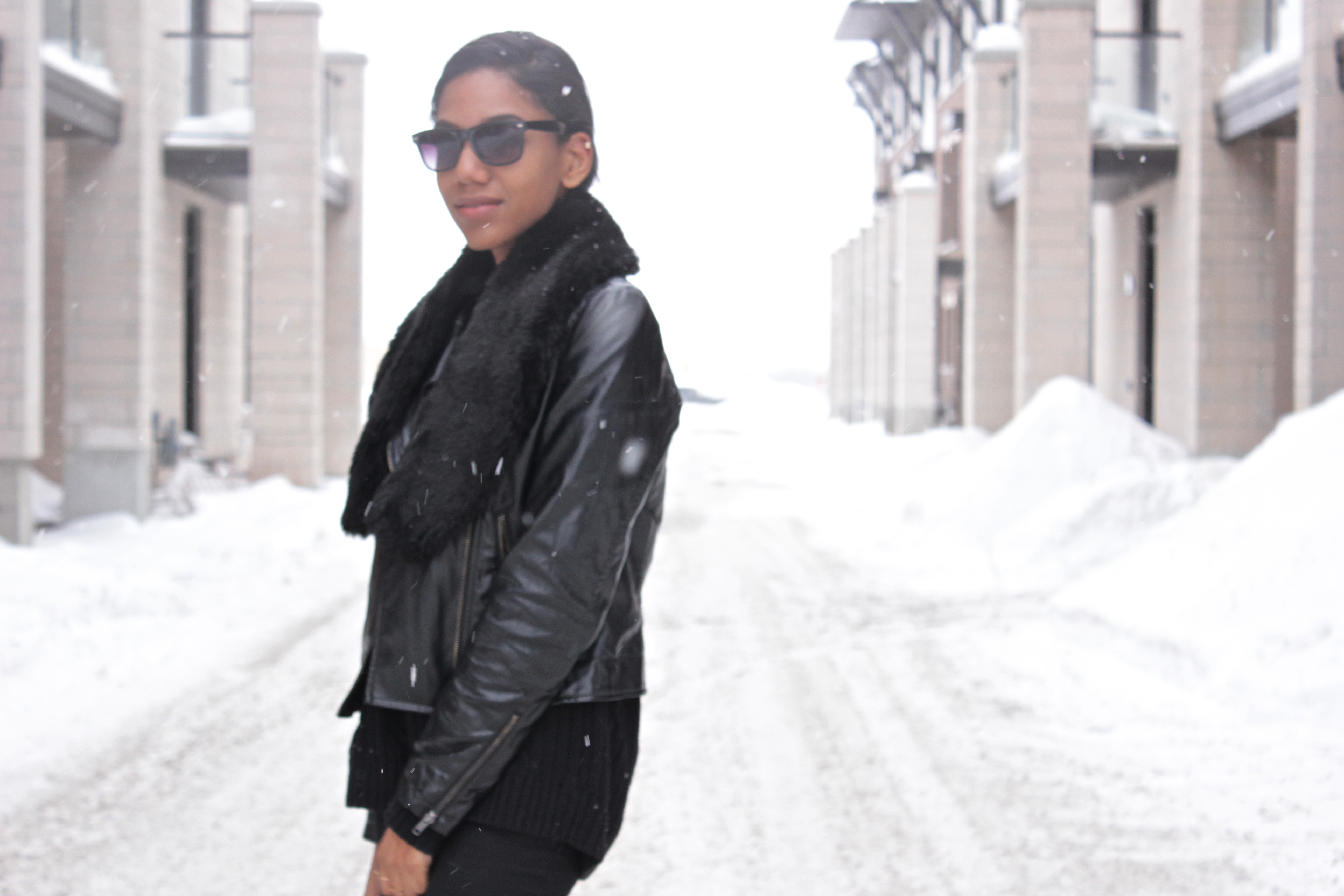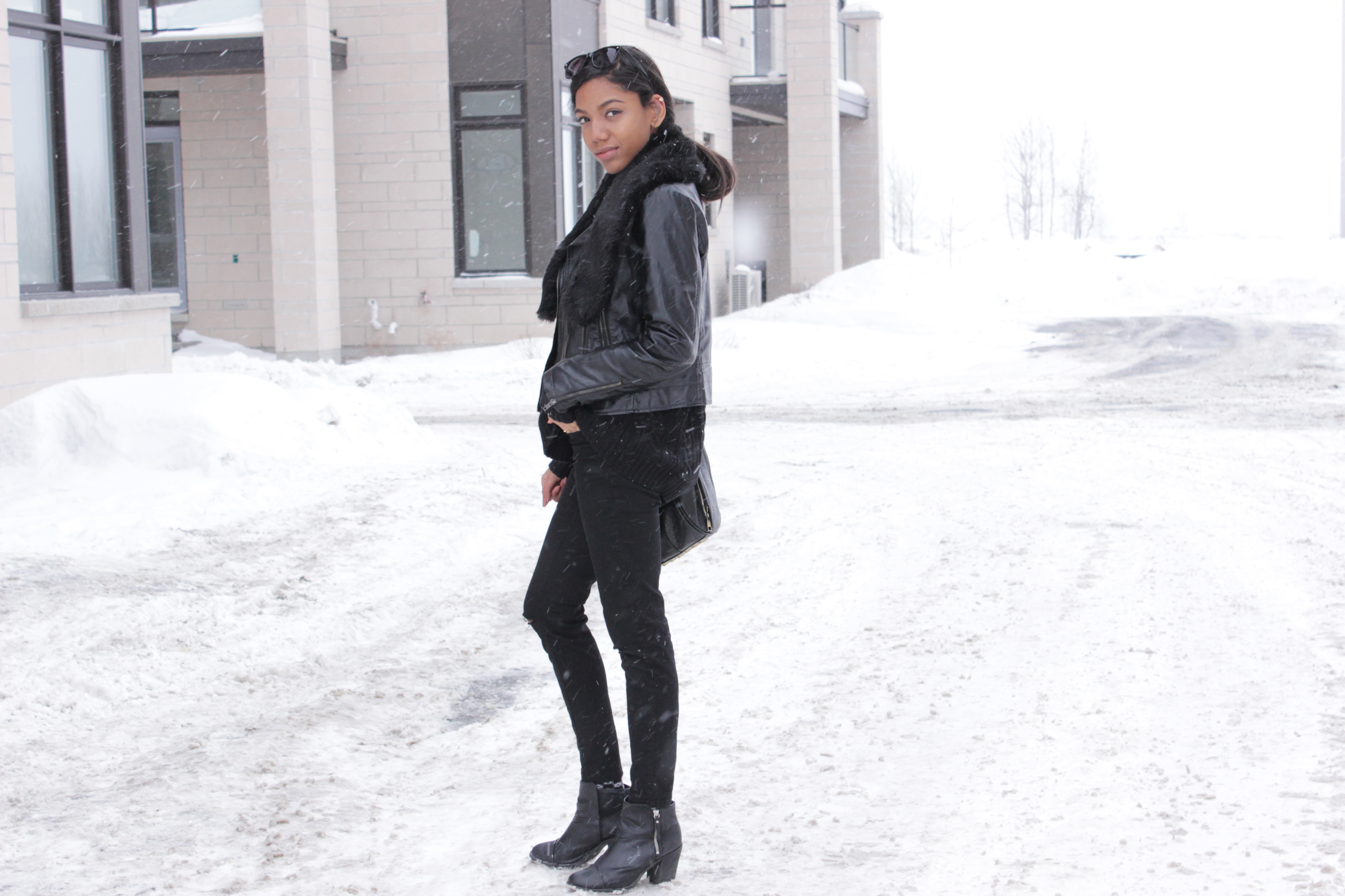 To ease me back into blogging I went with a fairly safe all black outfit to stroll through the snow. Though I’m never opposed to an all black look, it can get a little boring. To avoid that, I usually make sure to include different textures in the outfit. For example, in this look I played with leather, knits and fur to add some interest and keep the look from falling flat. You can apply this trick to any outfit really, not just monochromatic ones but I find it’s a must when wearing one colour from head to toe.