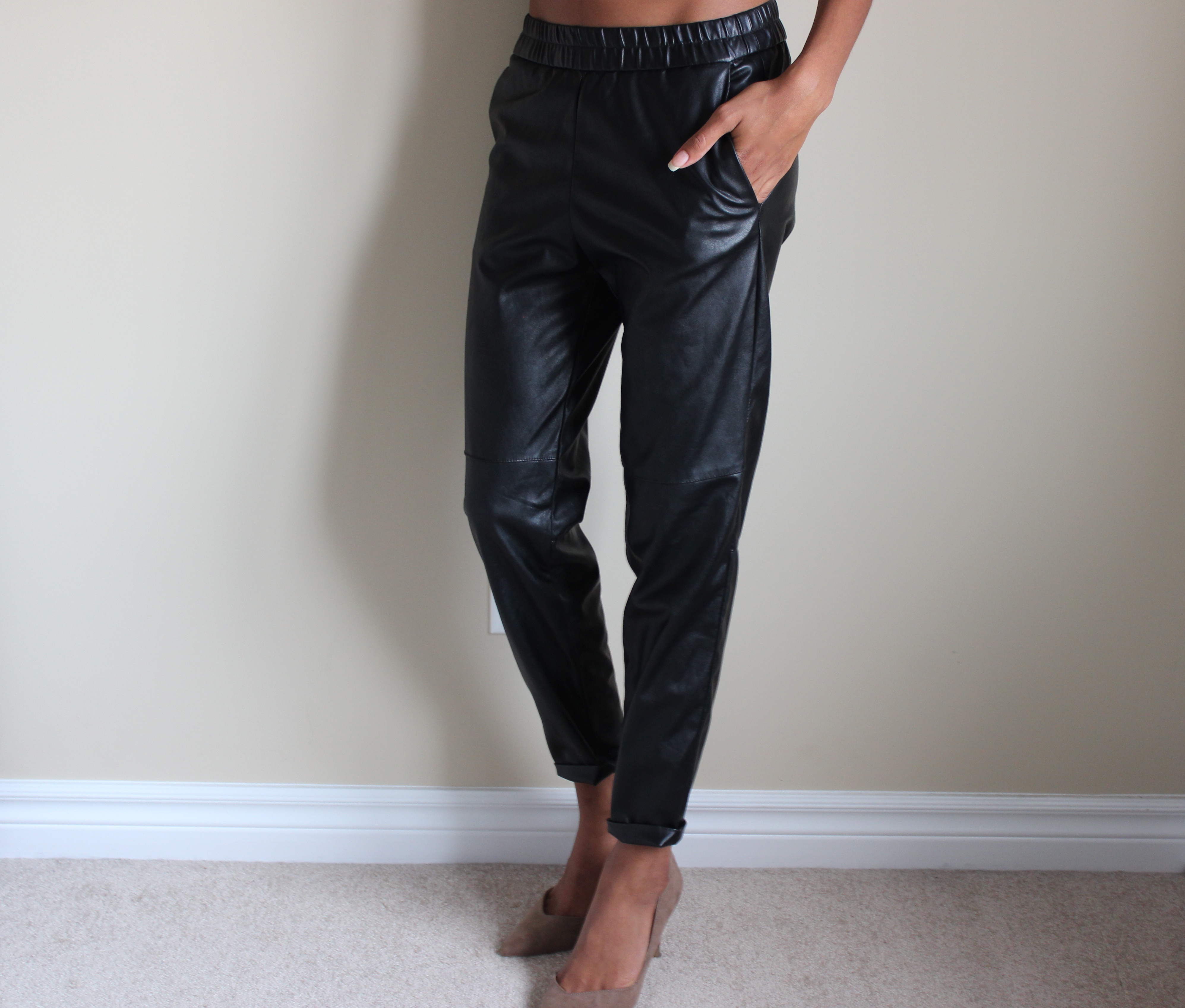 On the left: I picked up these leather joggers at H&M for only $10 on sale!! I LOVE sales!!! And I really like these and can’t wait to style them, they’re the perfect bottoms for fall. (Similar here)