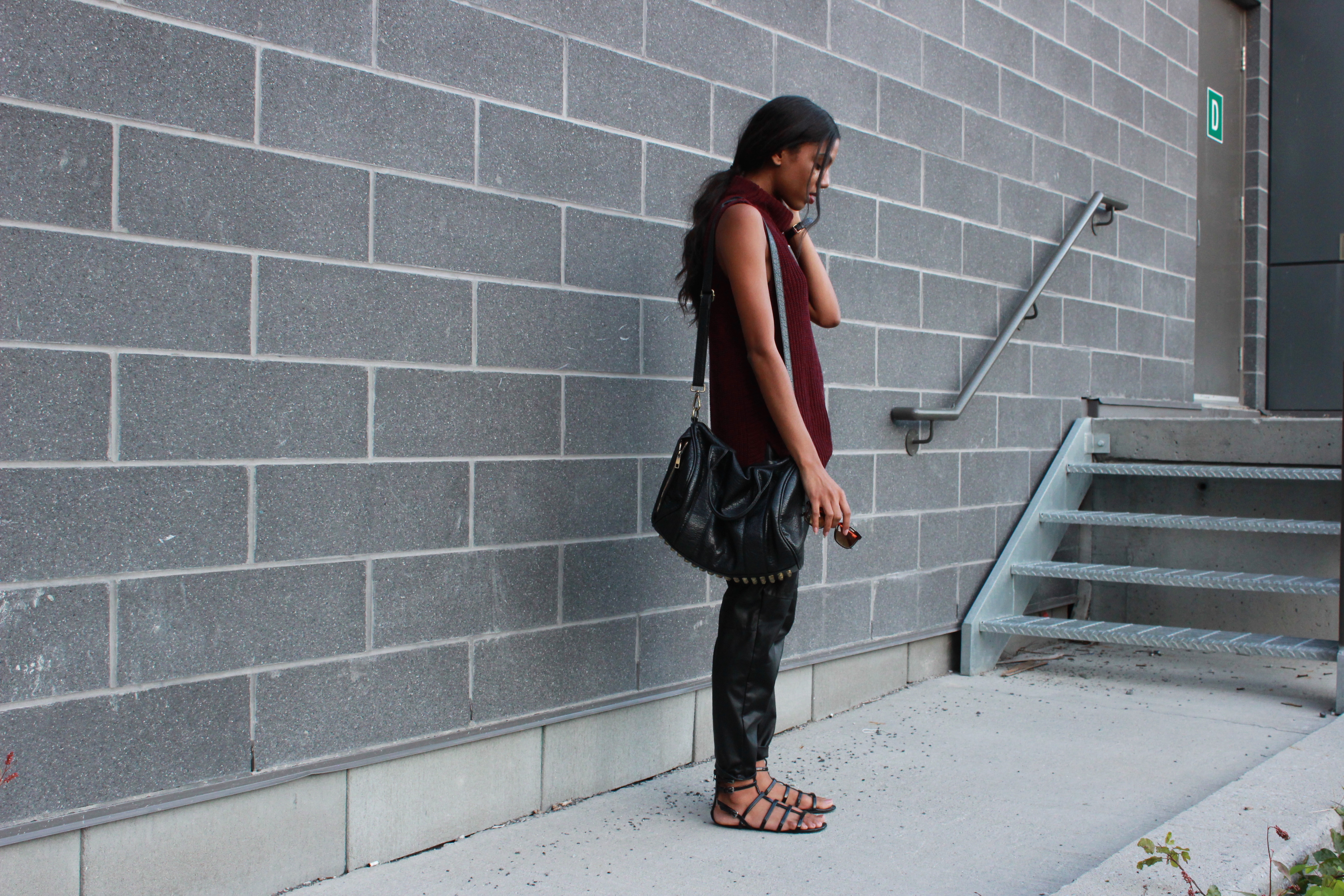 This is my first official fall post, so I put together this look that I felt was pretty appropriate for fall considering the colours and fabrics of the pieces I styled together. If we’re considering the fact that this “sweater” (can I even call it that?) is sleeveless and that I’m wearing sandals, then maybe it’s not so fall appropriate but we do get those random days where the weather is quite co-operative. If not, you could easily add on a jacket and swap out the sandals for some ankle booties.